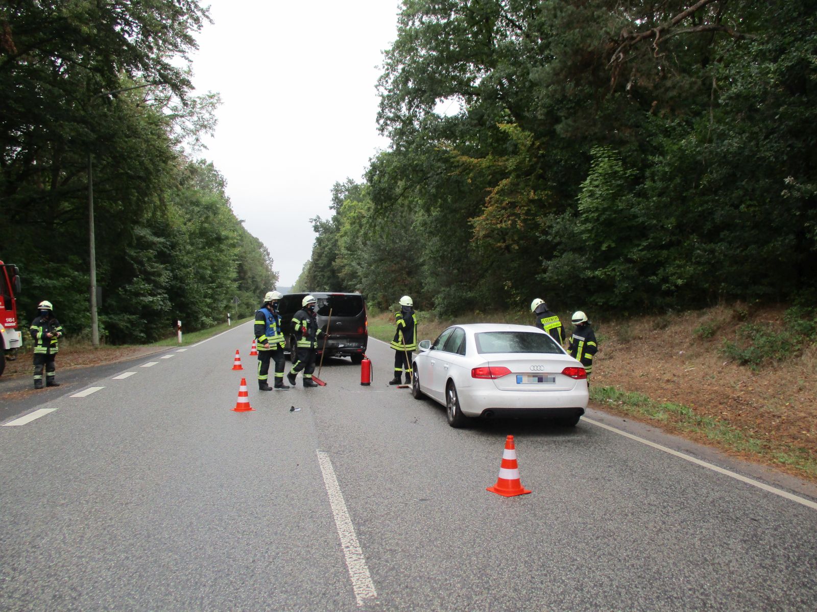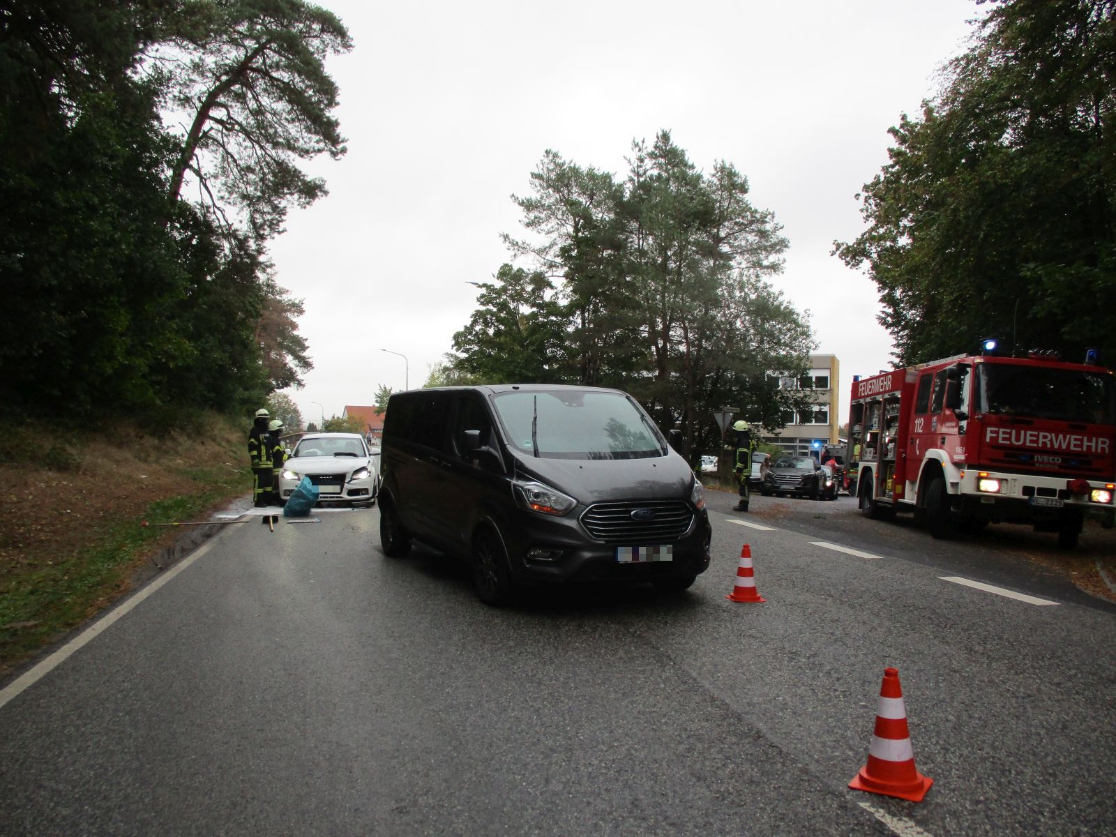 Bei einem Zusammenstoß zweier PKW wurden zwei Personen verletzt, darunter eine Schwangere. Die Verletzten wurden bis zum Eintreffen des Rettungsdienstes betreut und die Landstraße voll gesperrt. Wir sicherten die Einsatzstelle ab, stellten den Brandschutz sicher und streuten ausgelaufene Betriebsstoffe ab. Nach der Bergung der Unfallfahrzeuge wurde die Einsatzstelle an die Polizei übergeben.